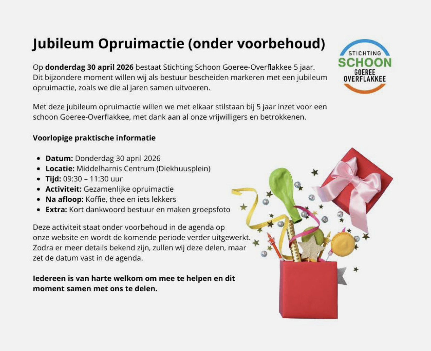 We vinden het belangrijk om het probleem van zwerfafval bespreekbaar te maken én aan te pakken. Met een groeiend netwerk van vrijwilligers, bedrijven en organisaties werken we elke dag aan hetzelfde doel: een schoon en stralend Goeree-Overflakkee waar we allemaal trots op kunnen zijn!